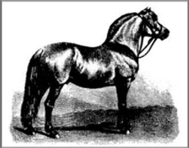 The unspoken ideal of the Fjord Horse type is the stallion Rosendalsborken. The image to the right is derived from a photographic plate in 1880, when he was in Germany. He was 18 years old in this picture.