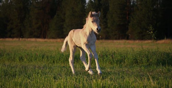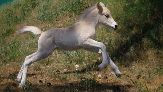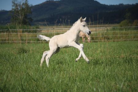 Solar - born on the day the solar eclipse, is a stunning white dun colt with tons of presence and confidence. Both parents contributed their super necks, uphill build and breed character. There is no doubt that Solar was born to be stallion!