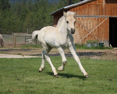 Jorina is a breathtaking white dun filly out of our red dun mare Jorun and by Siljar. We just love how this cross worked! She is leggy, has good bone but is still refined and has a beautiful eye. Jorina has shown from the first minute that she has a HUGE personality and we are thrilled to raise this beauty and see how she matures!